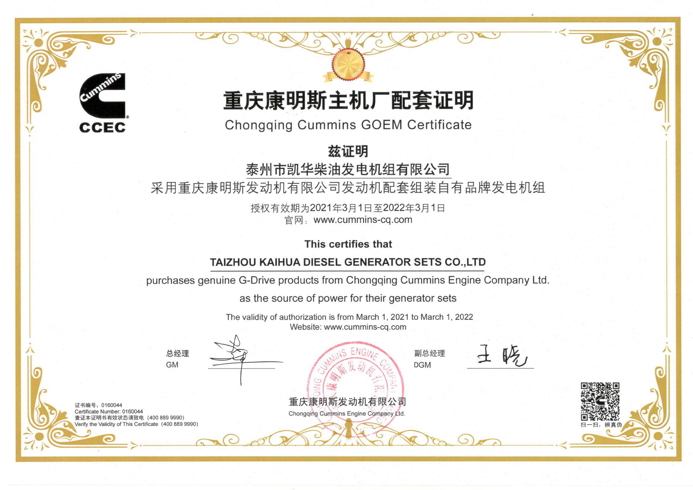 泰州市凱華柴油發(fā)電機(jī)組有限公司創(chuàng)建于2003年,是一家集柴油發(fā)電機(jī)組燃?xì)獍l(fā)電機(jī)組的研發(fā)、生產(chǎn)、銷售為一體的高新技術(shù)民營企業(yè),公司座落于“漢唐古郡,淮海名區(qū)”,具有“鳳凰城”美稱的祥泰之州——江蘇省泰州市,地處中國經(jīng)濟(jì)最發(fā)達(dá)的長三角經(jīng)濟(jì)圈,水陸空立體交通,地理位置十分優(yōu)越。公司目前注冊資本金11800萬元人民幣,生產(chǎn)基地占地六十畝,現(xiàn)有各類高素質(zhì)員工一百多名,專業(yè)技術(shù)人員達(dá)46人,其中高級技術(shù)人員16人,年銷售額近6億元。 公司主營產(chǎn)品:3~3000KW陸用柴油發(fā)電機(jī)組,15~600KW移動拖車電站,12~1000KW船用應(yīng)急柴油發(fā)電機(jī)組,各種靜音型、中高壓、多機(jī)并聯(lián)、燃?xì)獾忍胤N機(jī)組以及進(jìn)口系列柴油發(fā)電機(jī)組,可滿足不同客戶的一切電力需求,還可滿足用戶不同電壓、不同頻率的要求。凱華公司是康明斯品牌的授權(quán)代理商,專業(yè)生產(chǎn)供應(yīng)康明斯柴油發(fā)電機(jī)組。